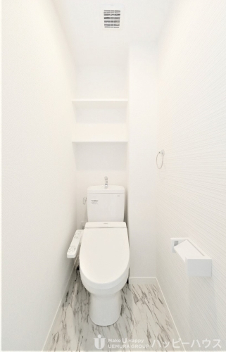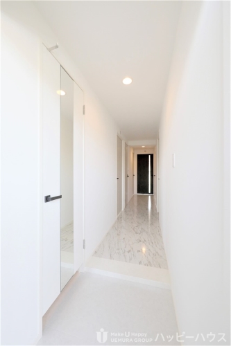 上村建設プレアシリーズ。従来のステラシリーズよりワンランクグレードを上げて設計。床は傷のつきにくいメラミン素材を採用。玄関から廊下までを高級感ある大理石調の床と白いクロスでデザイン。バルコニーもウッドデッキ調の防水シートを採用。インターネットはBBIQ光。速度1Gを個別配線し速度低減を解消。給水管にはミネラル発生装置を搭載。防犯設備も完備した理想の賃貸住宅。