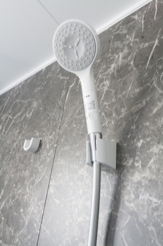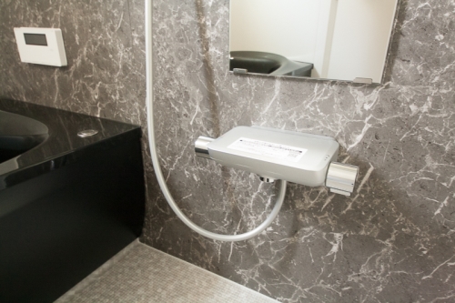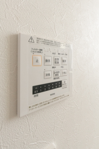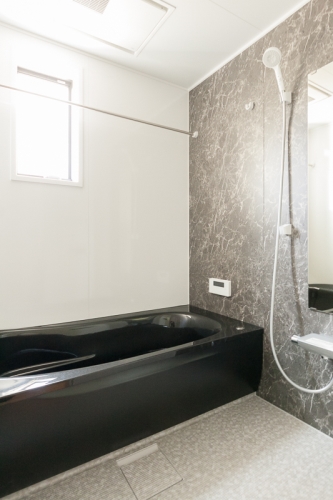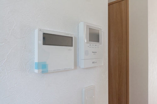 【駐車場敷地内2台無料・宅配ボックス付き】エアコンはリビングに1台設置。浴室乾燥機、追い炊き機能付きの浴槽は黒色で高級感があります。都市ガス採用。玄関扉は顔認証!