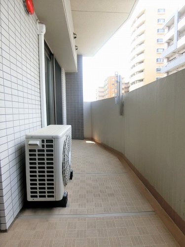 8F各部屋バルコニーは道路斜線制限上,庇が半分程露出となります。
